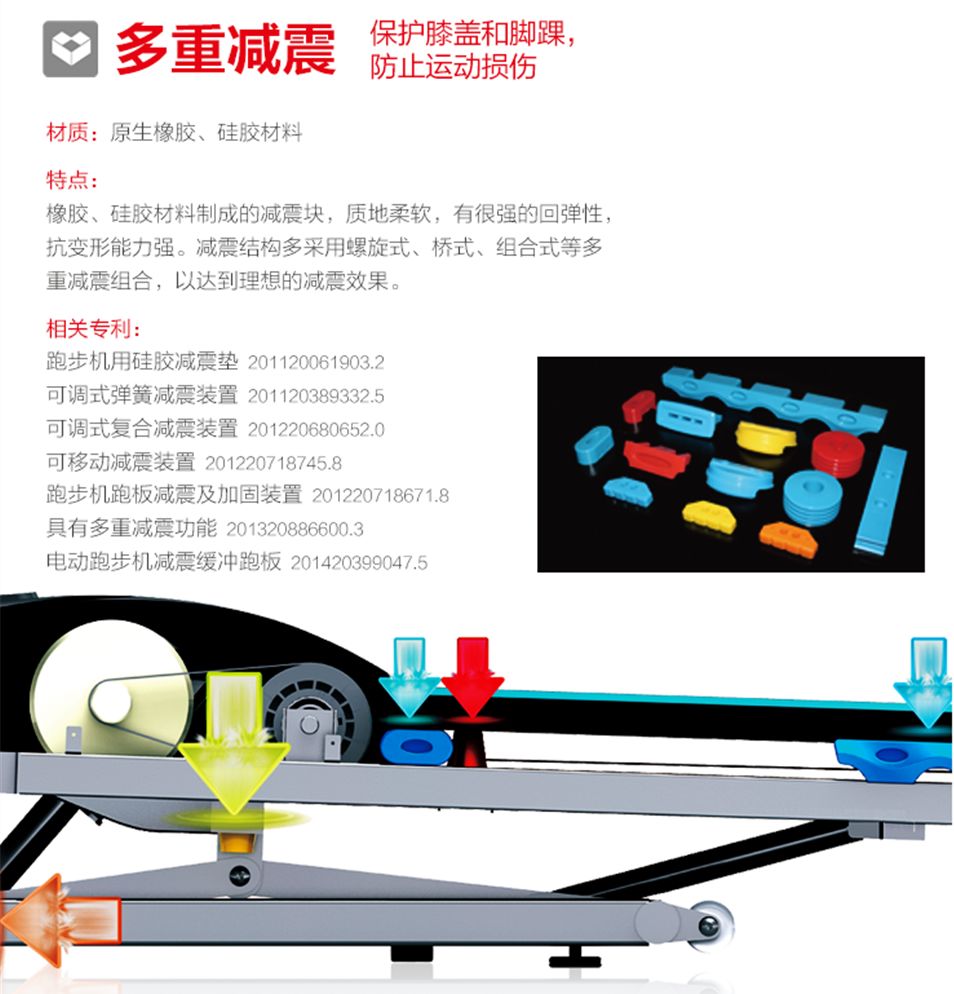 3、匯祥跑步機多(duō)重(chóng)減(jiǎn)震係統,采用原生橡(xiàng)膠、矽膠材料,質地柔軟,有很(hěn)強的(de)回彈性,抗變(biàn)形能力強。減震結構多采用螺旋式、橋式、組(zǔ)合式等多重減震組合,以(yǐ)達到理想(xiǎng)的減震效果。